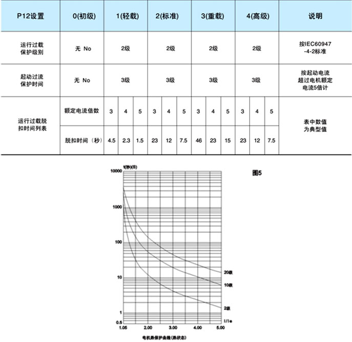 ◆ 輕載、標(biāo)準(zhǔn)、重載三個(gè)保護(hù)級(jí)別具備完全的保護(hù)功能,區(qū)別在于電機(jī)過(guò)載熱保護(hù)時(shí)間曲