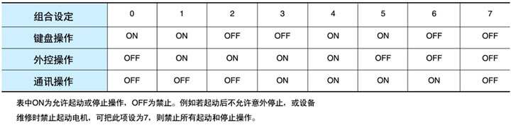 ■ 7種組合控制方式:為了更靈活方便地對(duì)軟起動(dòng)器進(jìn)行起動(dòng)和停止操作,設(shè)置了7種不同的操作組合方式供用戶根據(jù)需要進(jìn)行選擇,設(shè)置項(xiàng)FD組合方式如表2: